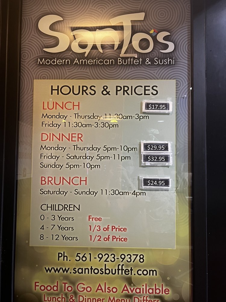 SanTo’s Modern American Buffet & Sushi offers a diverse menu combining Japanese, Sushi, and Asian Fusion cuisines. Located in Boca Raton, FL, this restaurant provides a unique dining experience with options for vegans and vegetarians. The buffet includes a wide range of dishes, from sushi and seafood to meat and dessert. Customer reviews highlight the quality of the picanha, cheesy bread, tempura, fried rice, and noodles. The brunch buffet is a favorite, with fresh made-to-order eggs and a variety of options. The sushi selection is extensive, featuring traditional rolls as well as unique creations like buffalo chicken sushi. The restaurant's atmosphere is casual and family-friendly, making it a great spot for lunch or dinner. With offerings such as private dining, happy hour specials, and free Wi-Fi, SanTo’s Modern American Buffet & Sushi caters to a diverse range of diners.